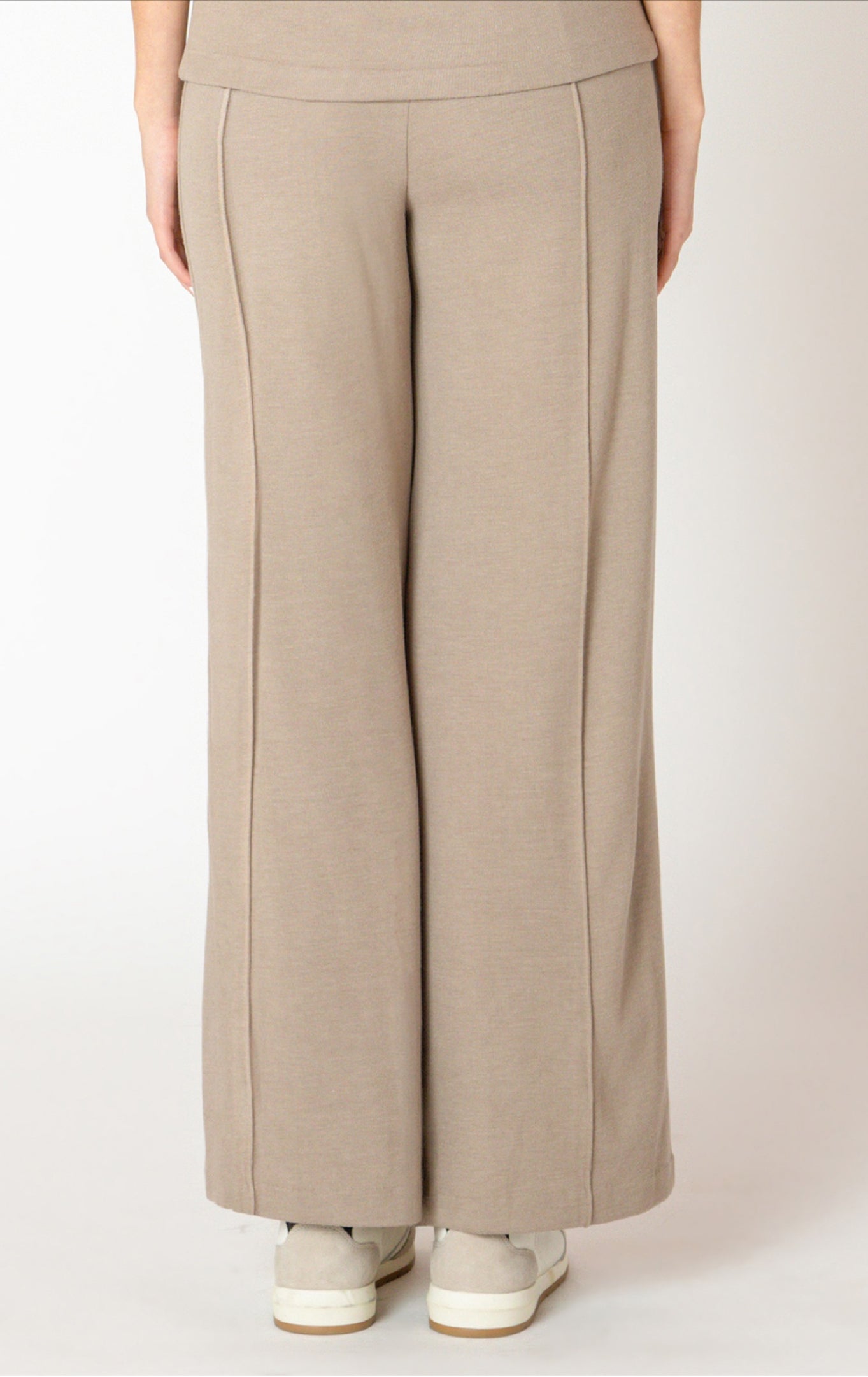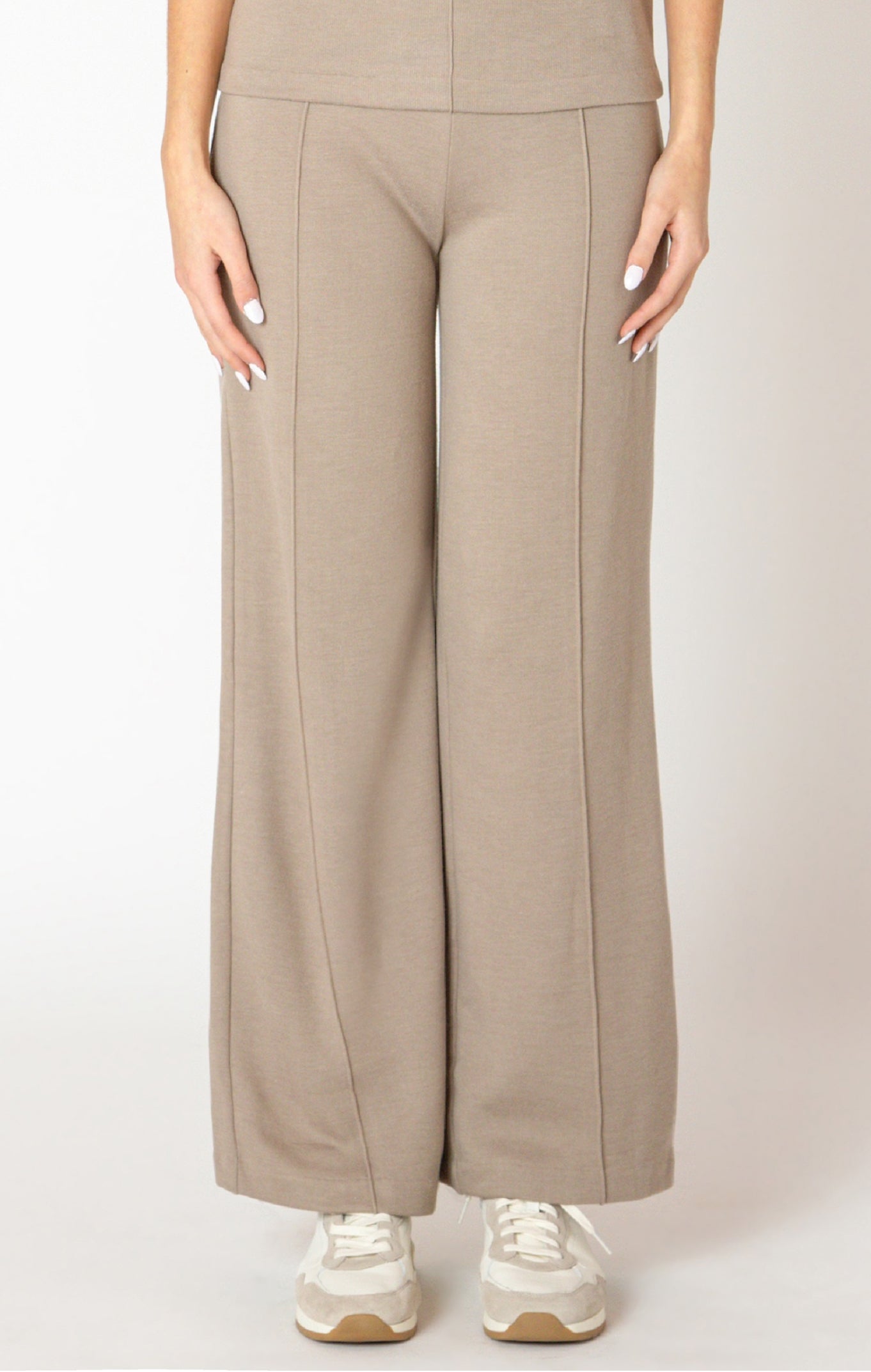 Expertly crafted in a cotton/polyester blend, the Black Tape Wide Leg Pant offers superior comfort and durability. With its seam detail and knit fabric, this pant is both stylish and practical. Perfectly paired with the funnel neck almond top, this pant is a must-have for your fall 2025 wardrobe.