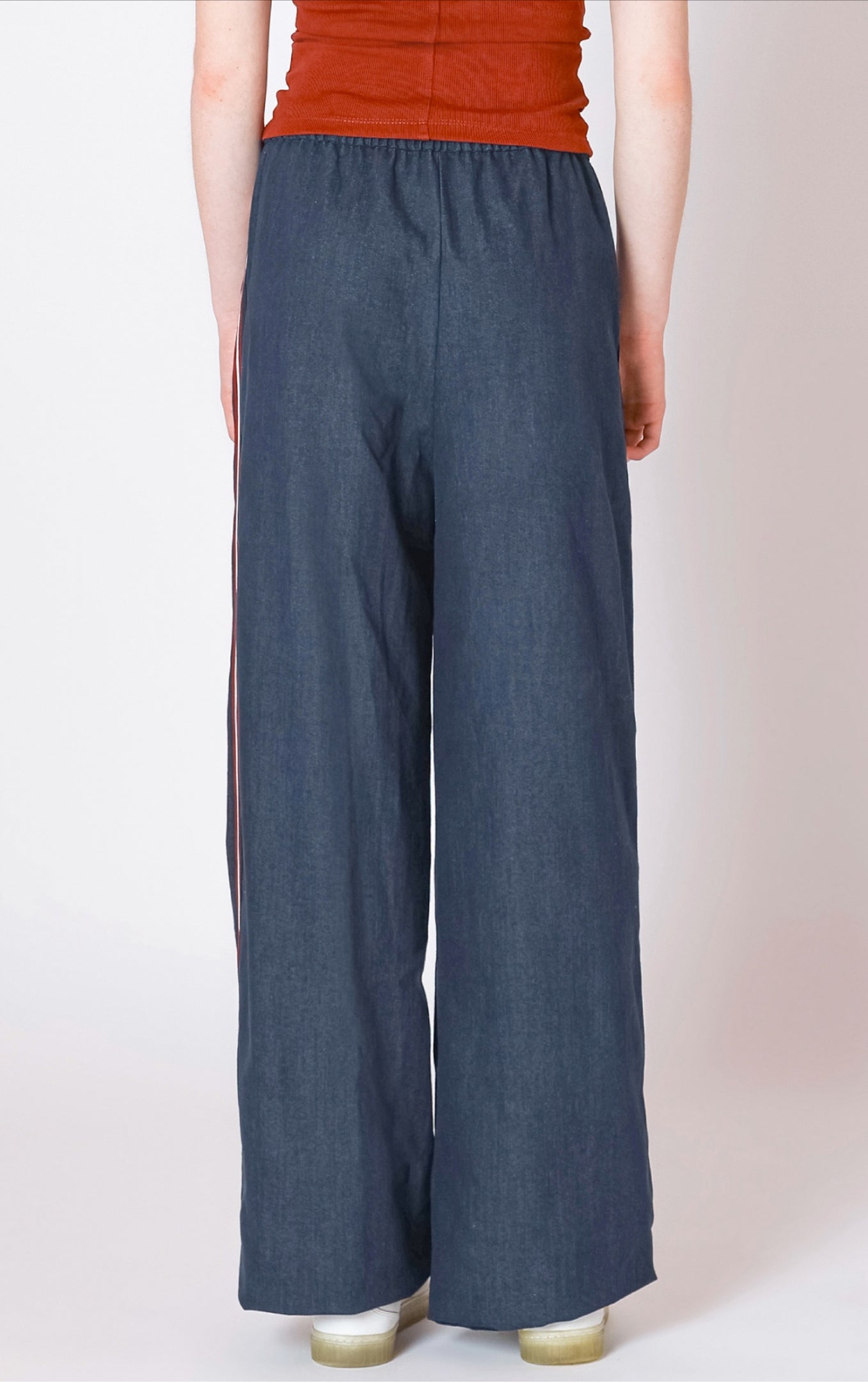 The Dex Side Stripe Pant is a versatile addition to your wardrobe. Made with denim material and a wide leg design, these jogger-style pants offer a comfortable fit and stylish look. The tie waistband adds a touch of detail while the side stripe matches perfectly with the Dex Burnt Orange Ribbed Tank. A must-have piece from the Fall 2025 Collection.