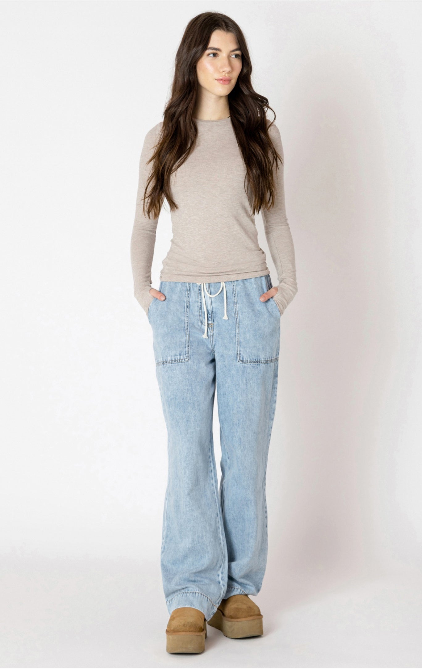 Introducing the Dex Wide Leg Denim Jogger from our Fall 2025 collection. Made with a blend of cotton and tencil, this jogger features a drawstring and paper bag waistband, adding both style and comfort to your wardrobe. Elevate your look with this versatile and trendy piece.