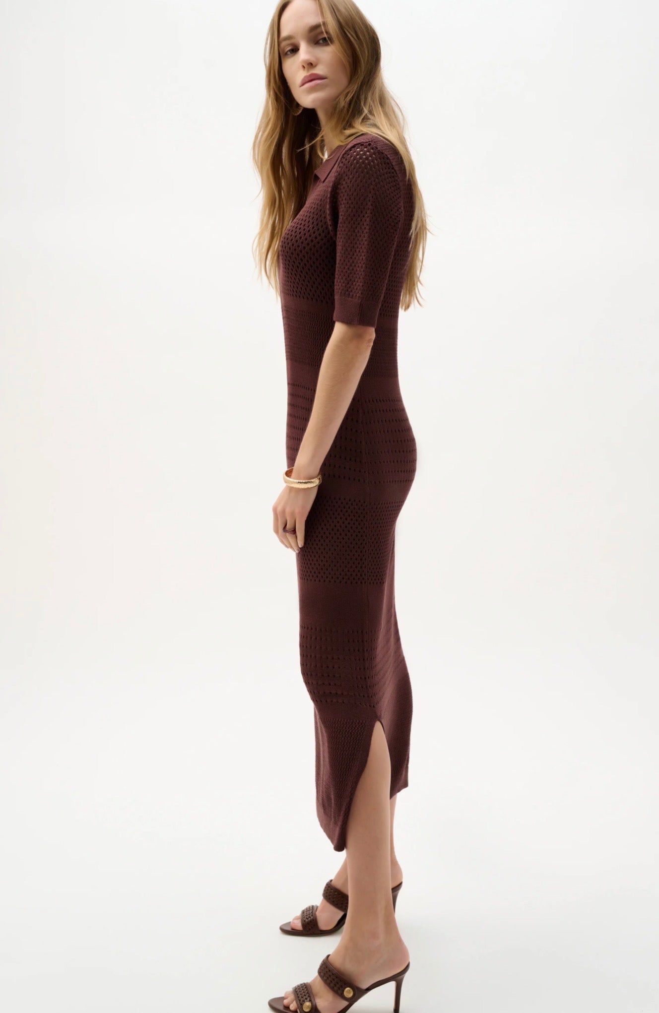 An airy open-stitch knit shapes this viscose sweater dress, styled with a V-neckline and shirt collar for a tailored touch. Designed with short sleeves and paired with an under slip, it offers easy elegance in a midi length.