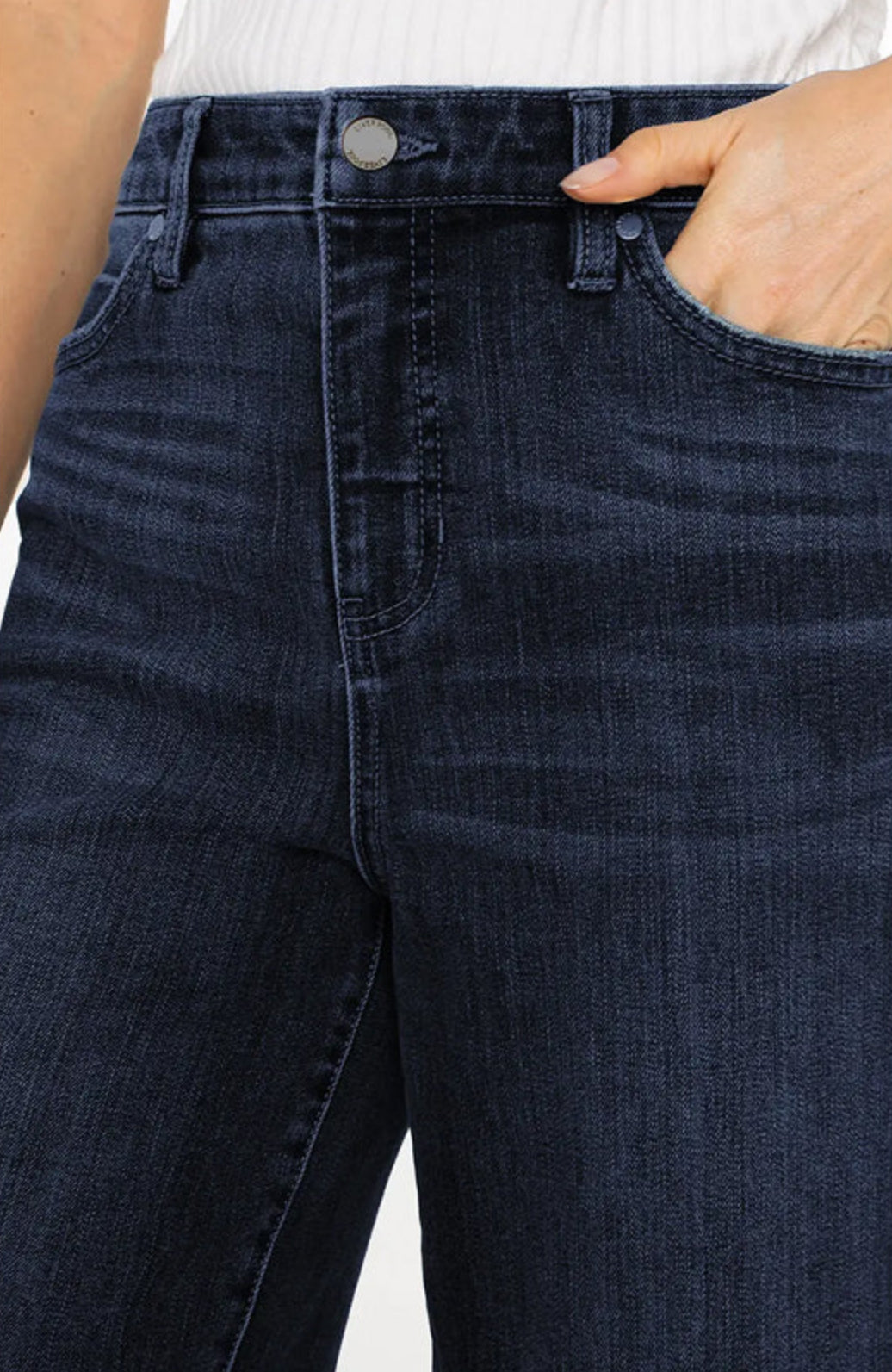 Elevate your wardrobe with the Liverpool Stride Hi Rise Wide Leg Jeans in Upland. Crafted from soft, slightly stretchy denim, these jeans offer unmatched comfort and a stylish look. Featuring a high waist and wide, flared legs with a 7/8 length, they create a flattering, modern silhouette perfect for pairing with heels or sneakers. Equipped with five pockets, a zipper and button closure, and a faded finish, these versatile jeans are an essential for effortless, chic outfits. Made from 74% cotton, 25% polyester, and 1% elastane for durability and stretch.