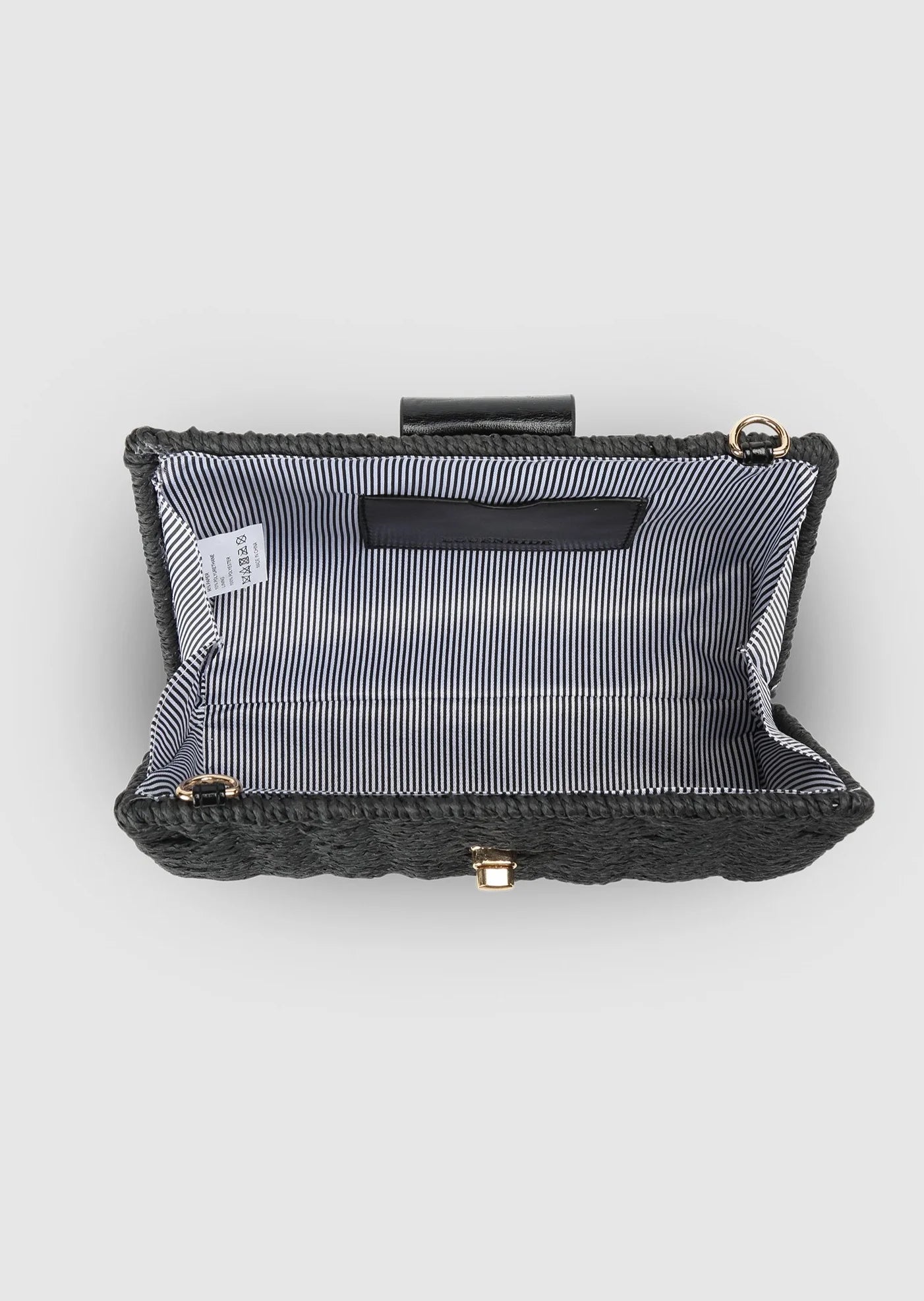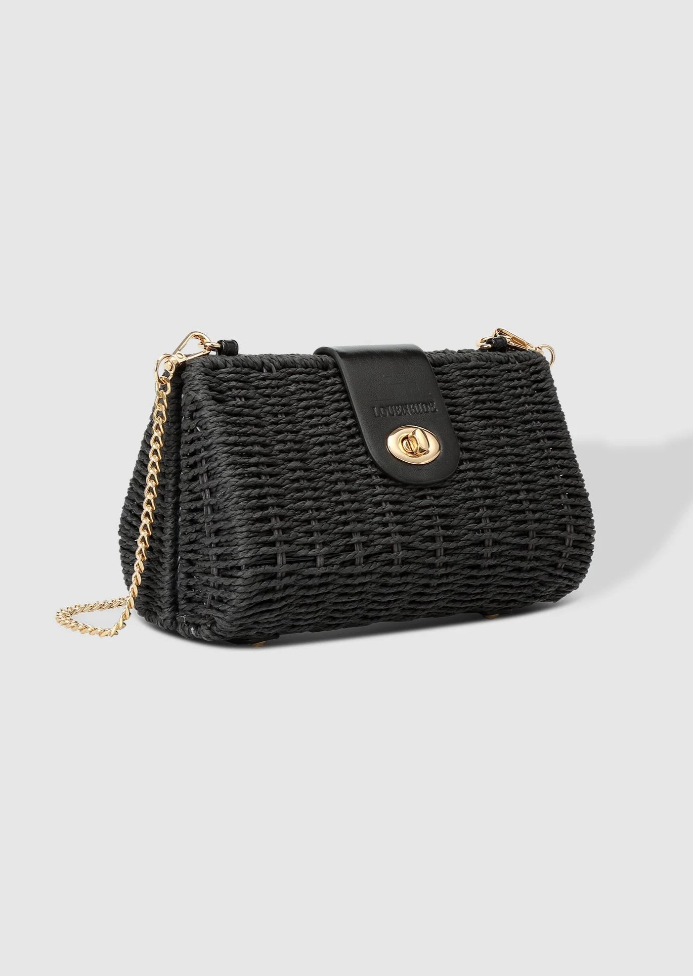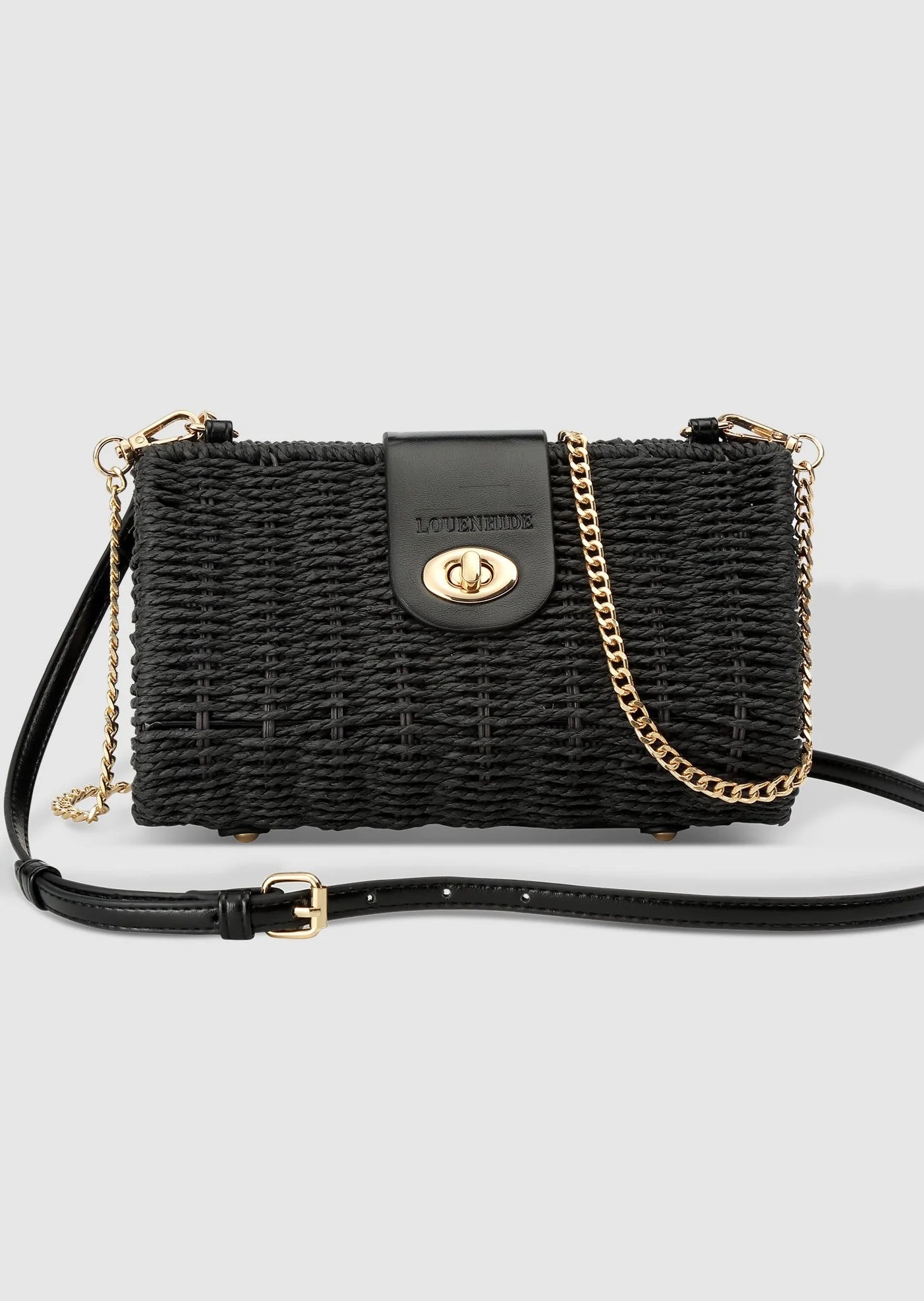 The Louenhide Ophelia Black Raffia Crossbody Bag is an effortlessly luxe, structured crossbody, perfect for summer evenings. Adding a touch of luxury, the metallic vegan leather creates a harmonious fusion of textures that is sure to turn heads. Opening effortlessly to reveal a spacious interior, this luxe women's crossbody bag, allows you to organise your summer necessities while keeping them secure with the turn lock closure. The Ophelia Black offers three ways to wear to completely customise your look. Keep it casual with the metallic vegan leather extension strap or simply detach to wear as an evening clutch. Take your outfit to the next level with the additional light gold chain crossbody strap for an added touch of feminism to your date night style. Elevate your holiday experience and treat yourself to the perfect companion for your sun-soaked journeys.