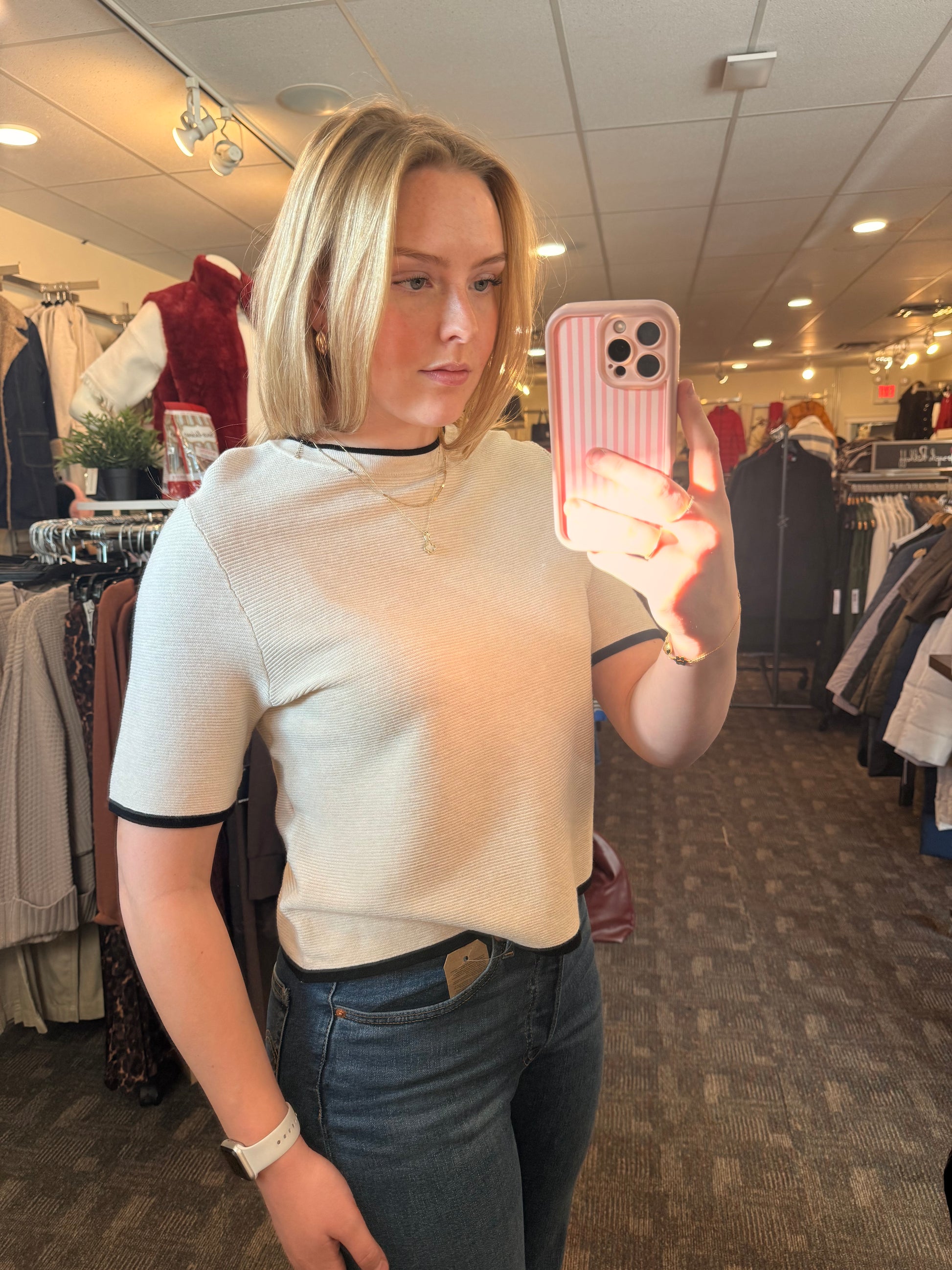 SC-DOLLIE 793 is a Pullover crafted from 75% Viscose, 25% Nylon. The pullover features a round neckline, short sleeves, and textured ribbed design with contrast trim detailing. Pair it with tailored trousers or a relaxed skirt for a stylish look.