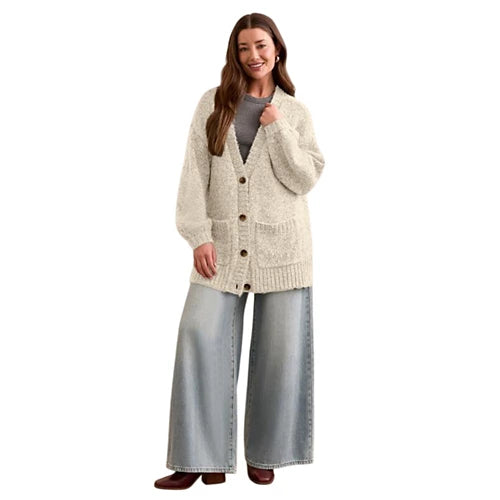 The perfect boyfriend cardigan for those craving coziness, offering instant warmth and comfort. Its oversized fit and casual puff sleeves create a relaxed vibe that layers effortlessly over any outfit. The buttoned front allows for easy wear, while pockets provide a spot to keep your hands warm.