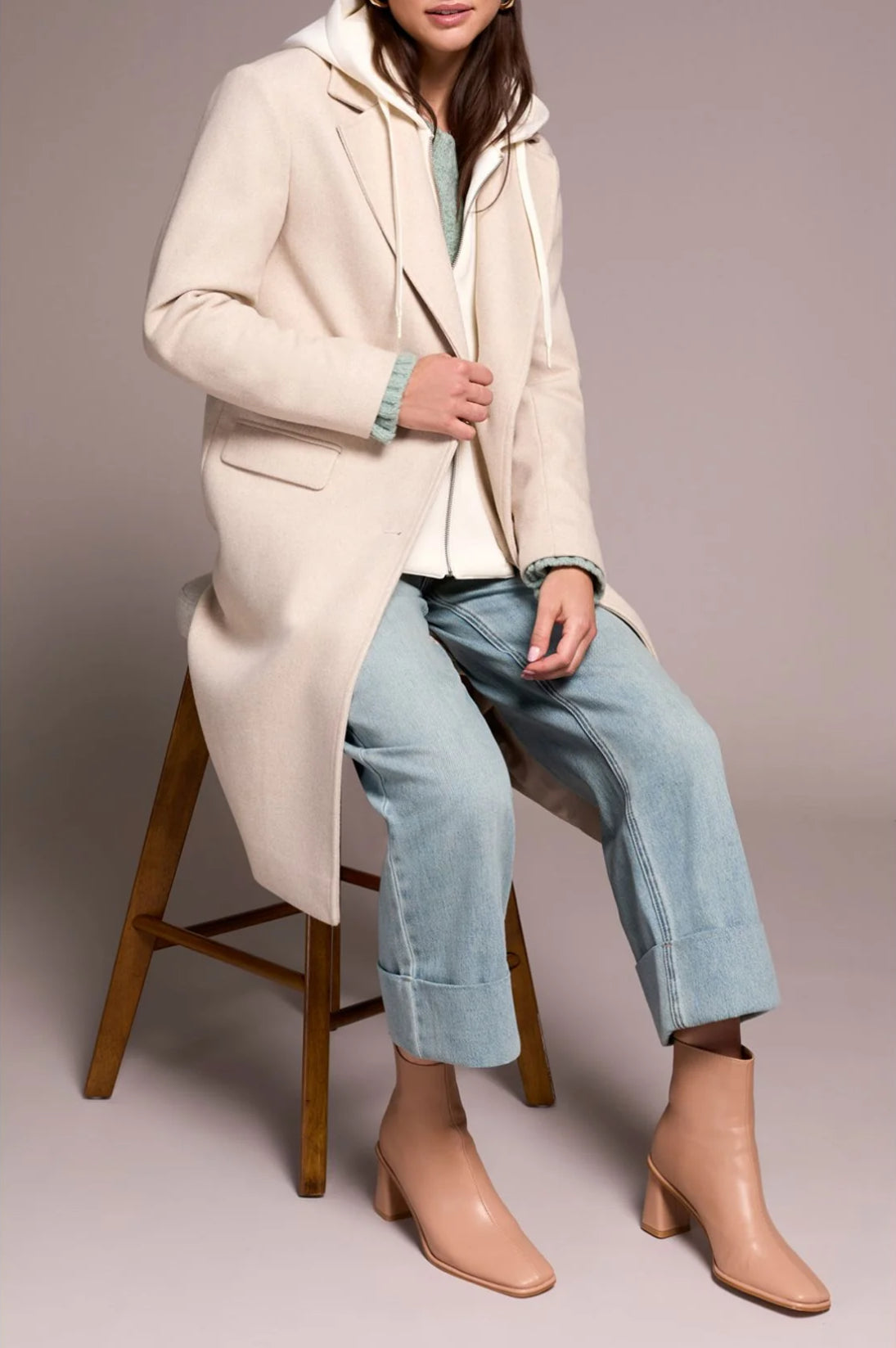 A coat that gets layering so right, you’ll wonder how you ever lived without it. This trench-style coat features a built-in fooler hoodie for that perfectly casual-meets-polished vibe—without the bulk. The notched collar and flap pockets keep things classic, while the soft neutral tone goes with literally everything in your wardrobe. Ideal for transitional weather, office commutes, or Saturday morning coffee runs when you want to look like you tried (but didn’t really).