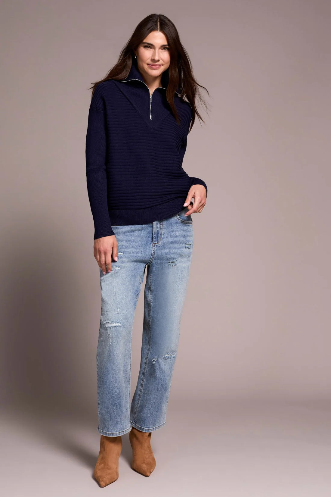 For a relaxed, cozy look, opt for a sweater with drop shoulders and a slightly boxy fit that ensures easy comfort. Crafted from soft-touch yarn, it’s perfect for cooler days. A zip accent on the V-neckline allows for an adjustable, flattering fit.