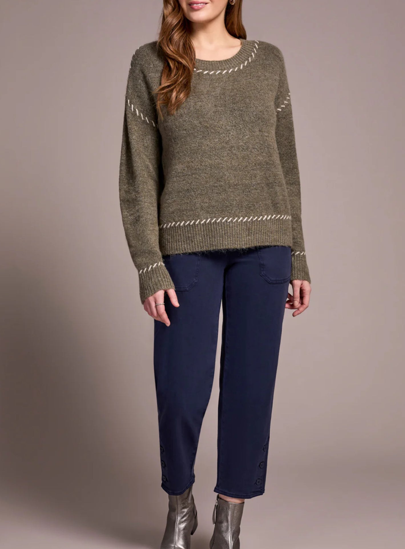 Stay cozy in style in this fun and fabulous long sleeve crew neck sweater. Featuring long sleeves, drop shoulders and blanket stitch detail. Soft cozy knit. Perfect with jeans or pants. Super versatile and fashionable!